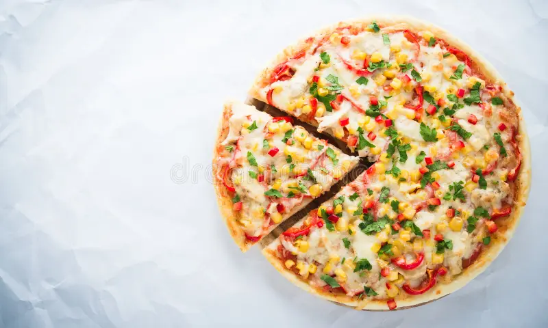 Sweet corn kernels combined with creamy mozzarella cheese spread evenly on a soft pizza base, baked till golden and cheesy.